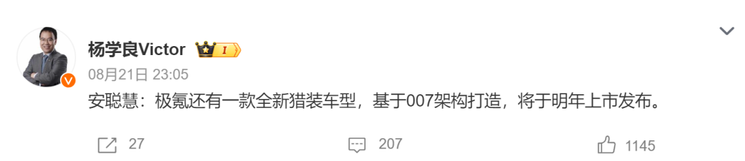 比如昨天上市的, baas 完了以後只要 14.99 萬的樂道 L60 ,比如馬上就要上市,有華為加持的智界 R7 ,甚至是自家兄弟,之前已經官宣過的 007 獵裝版,都有可能把他們的預算吸走。