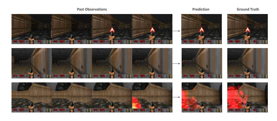 左側的四幅是遊戲中剛剛經過的四幀,中間是AI預測的下一幀畫面,右側則是實際的畫面