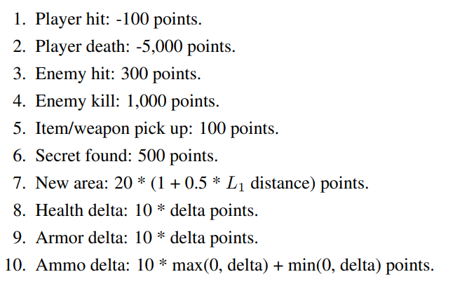 而針對這幾個“打機”AI,團隊也設計了一套賞罰機制:受擊、死亡就會扣分,而擊中、擊殺敵人則會加分,團隊還希望幾個AI能像人類一樣“舔圖”,給了發現秘密地區和長距離移動探索等行為一定的加分。