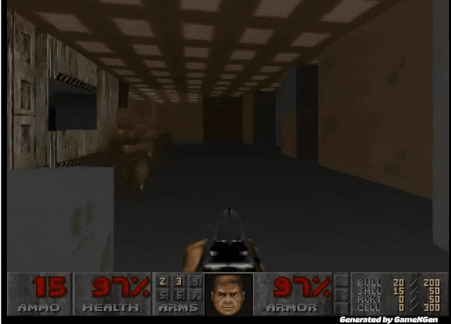而GameNGen這個AI模型則正好相反,它要根據現有畫面和玩家的輸入,通過自己對於《DOOM》的理解,去“即興創造”出後續的遊戲畫。從邏輯上,更像是在玩桌面RPG時,DM靠自己的創造力和遊戲理解,向玩家們描述場景和接下來遇到的敵人,只不過GameNGen這個“DM”靠的不是用文字和語言敍述,而是通過快速畫圖,給玩家看一段可以實時交互的動畫。