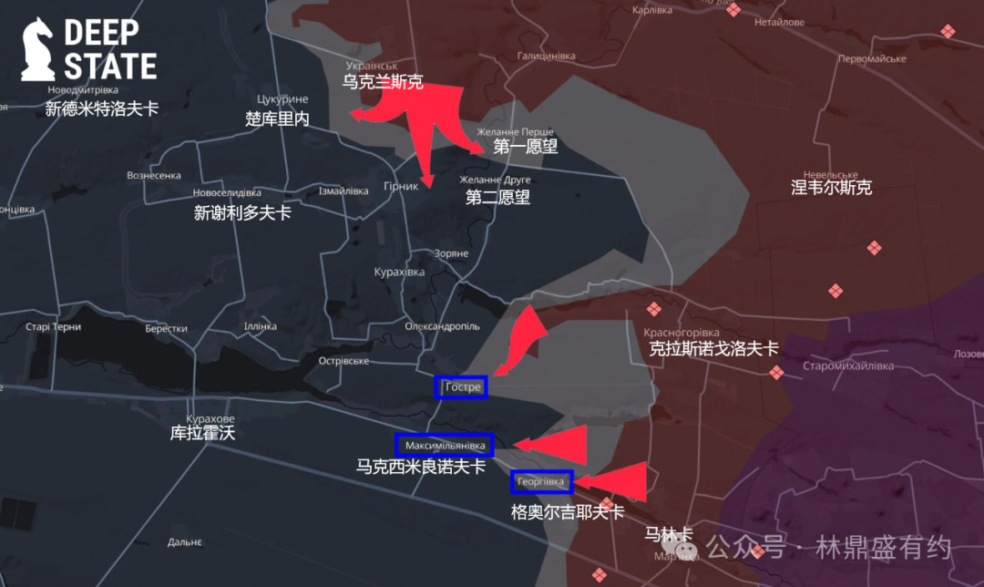 俄軍仍然試圖突破烏軍陣地,向庫拉霍沃方向挺進。這個方向,烏軍稍顯薄弱,烏軍沒有增援,而俄軍卻在此增兵,俄軍的主要對手是被打殘的第46旅,但仍然頑強抵擋俄大軍的強勢推進,格奧爾吉耶夫卡被俄軍奪佔之後,格奧爾吉耶夫卡-馬克西米良諾夫卡-奧斯特羅耶這一三角區域成為四戰之地,烏軍已難以持續支撐,估計不會太久就會被俄軍奪佔。此處就是典型的避實擊虛的俄軍發力方向所在。一旦俄軍完全實現意圖,除了劍指庫拉霍沃之外,還可以加強與烏克蘭斯克之間的一個戰略包夾口袋。