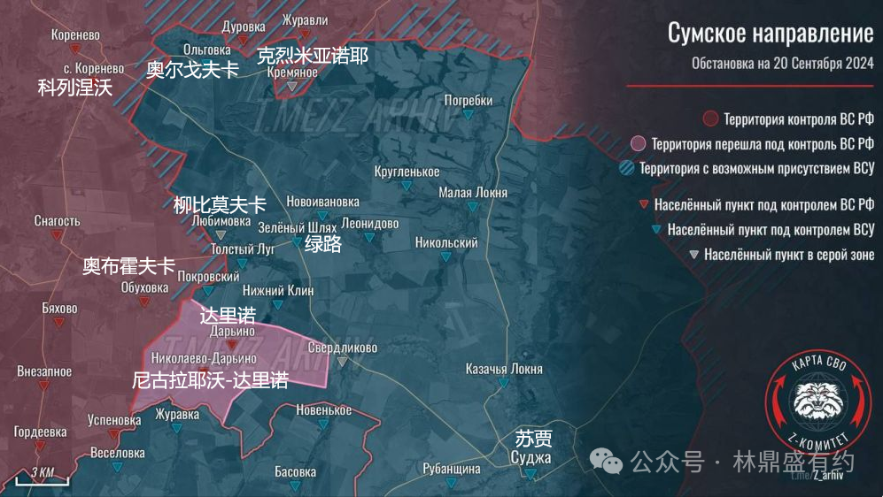 🔴科列涅沃方向的主戰場,由於烏軍強化了增援和反擊,俄軍主攻部隊進攻節奏開始放慢,開始改為穩紮穩打的推進。由於烏軍強化了對樞紐重地的柳比莫夫卡的增援,俄軍不再強攻柳比莫夫卡,而是採取兩翼迂迴包抄的策略,攻擊前進。俄軍認識到,比攻打堅城更重要的是,切斷這一物流樞紐的樞紐之地:綠路!事關烏軍在庫爾斯克北翼集團的補給生命線。切斷綠路的難度遠小於奪取柳比莫夫卡,因此,這也是典型的避實擊虛戰略的一種體現。這使得烏軍的防禦難度成倍增加。而對於烏軍的北線重兵集團,包括新伊萬諾夫卡,俄軍逐步的以遠程打擊為主,避免強勢驅逐,導致烏軍全線後撤,表現在,任由烏軍發起對奧爾戈夫卡和克列米亞諾耶的攻擊,只是在其側翼部署部隊,以備日後可能的包圍。事實上,由於澤連斯基要求烏軍保持全線攻勢,那麼,烏軍就高概率不再考慮後撤。如此一來,俄軍還有機會調兵遣將,悄悄構築包圍圈,重新做着將烏軍全部留在俄境內的美夢。按照俄軍事分析家的樂觀估計,認為長遠有機會將3萬烏軍包圍在俄境內。當然,不包括烏軍攻入俄本土以來的已被俄軍消滅的超過1.5萬以上的烏軍有生力量。