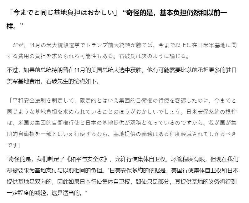 “如果在11月的美國總統選舉中,前總統川普梅開二度,他可能會比以往更強烈地要求日本承擔更多的在日美軍基地的費用。我們此前已經通過了安保方案,儘管修改幅度有限,但現在日本已經允許行使部分集體自衞權了,我們不再像以前那樣那麼地依賴美軍的保護,卻還被要求承擔和以前一樣高的、甚至是更高的在日美軍基地費用,這是不合理的。日美安保條約上面説得清清楚楚,美國行使集體自衞權和日本提供基地,這二者是相輔相成的。如果日本已經能夠部分行使集體自衞權了,那麼相應地,我們所承擔的在日美軍基地費用也應獲得一定程度的減免才對。”