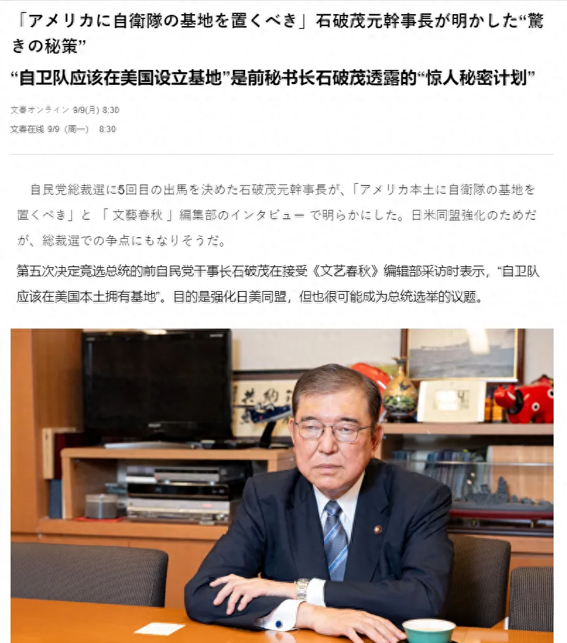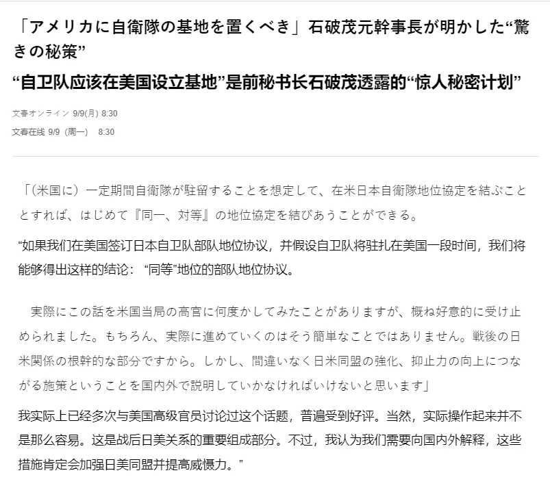 這兩天我在上網的時候刷到一條新聞,原始信源是日本知名媒體《文藝春秋》。《文藝春秋》最近採訪了日本前防衞相,同時也是下一任日本自民黨總裁有力競選者的日本著名右翼政客——石破茂。這個老東西在採訪過程中談到了很多敏感話題,其中就包括美日兩國的駐軍問題,只不過他説的不是駐紮在日本的美軍,而是應該是美國設立基地、長期在當地駐訓的日本自衞隊。