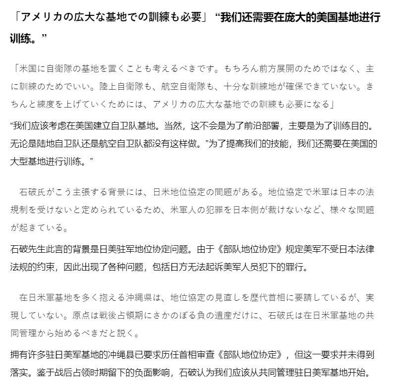 此外,提到自衞隊在美國本土設立基地的問題,石破茂認為,如果他的這一構想成為現實,那麼屆時日美兩國將不可避免地需要簽訂新的地位協定。石破茂説,有關構想並不是他一拍腦袋琢磨出來的——雖然看起來確實會給人這樣一種感覺,但實際上他在之前就已經向美國高官分享過他這一天才般的提議了,而且對方“在總體上也給出了善意的答覆”。石破茂還説,雖然執行起來不容易,但是他覺得還是有必要將“自衞隊在美駐軍”這一構想的必要性向日本國內外解釋清楚,因為“這無疑是加強日美同盟、提高我們的同盟威懾力的有力措施”。