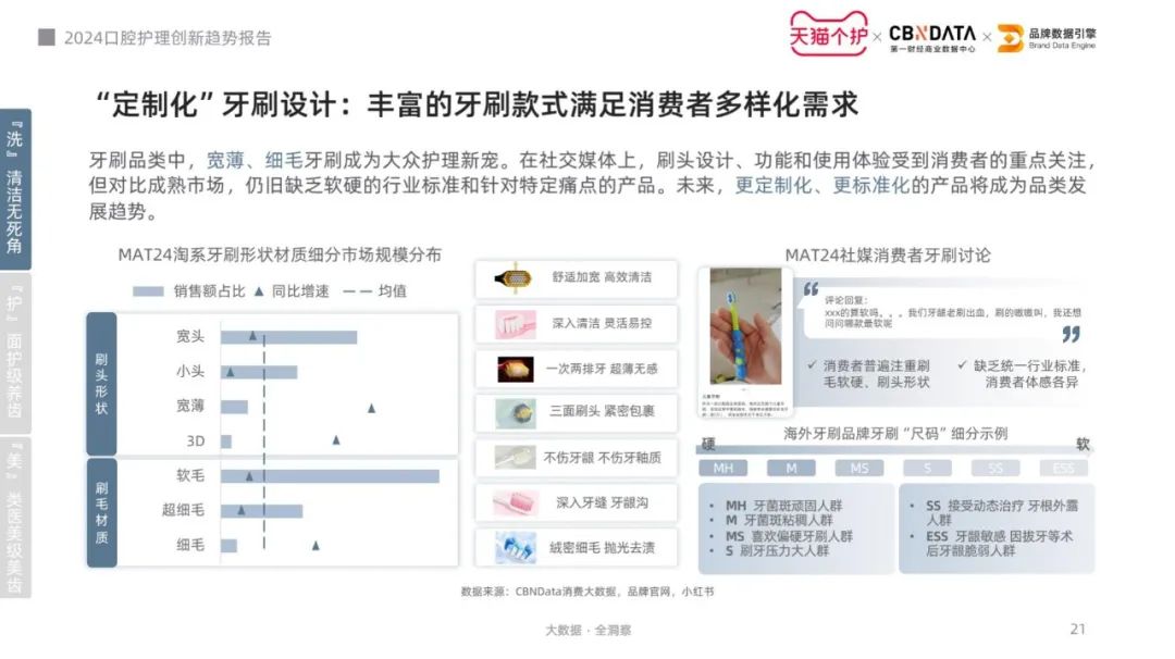 “XXX牙刷好用嗎?”、“牙齦總出血,請問哪款牙刷最軟呢?”……在社交媒體上,關於牙刷的討論層出不窮。當下,消費者在牙刷選購時,對刷頭形狀與刷毛材質有了更高的要求,寬薄、細毛牙刷成為大眾護理新寵。
