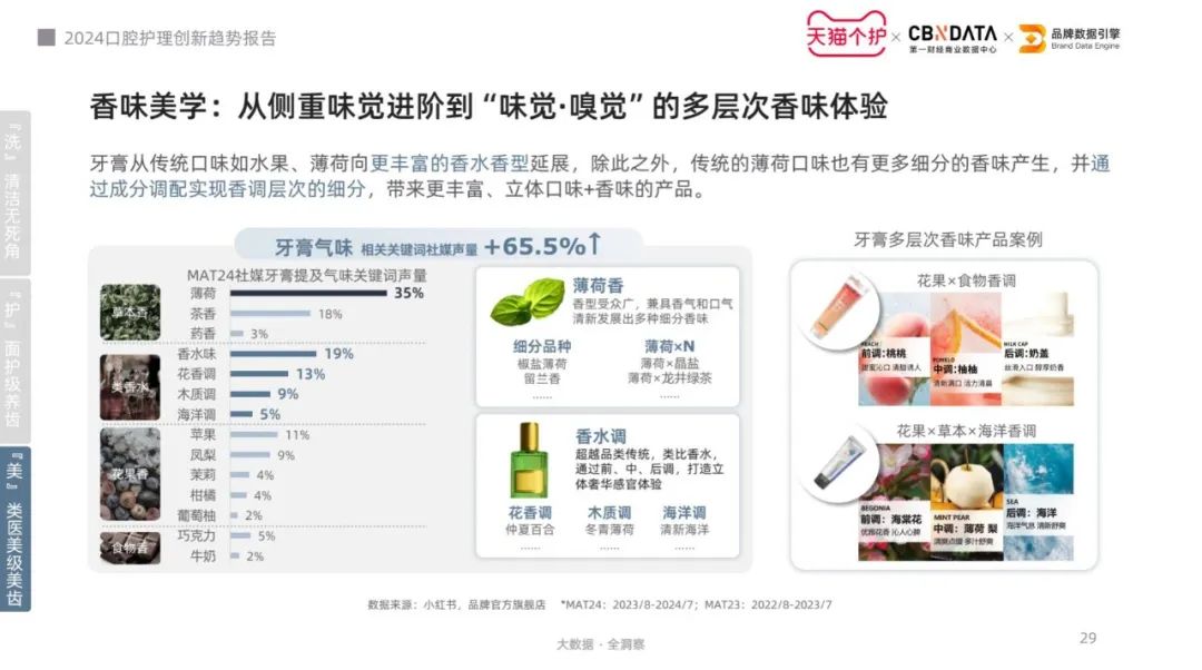**此外,作為與味覺、嗅覺極為貼近的產品,口腔護理產品的“芳香療愈”屬性也被進一步激發。**牙膏口味從傳統口味如水果、薄荷香型向更豐富的香水香型延展。雲南白藥牙膏就通過口味創新與成分調配實現了香調層次的細分,桃桃西柚奶蓋奶茶牙膏前調蜜桃,中調西柚,後調奶蓋,以清新果味碰撞醇厚奶香,提供甜蜜怡人、豐富立體的芳香體驗。