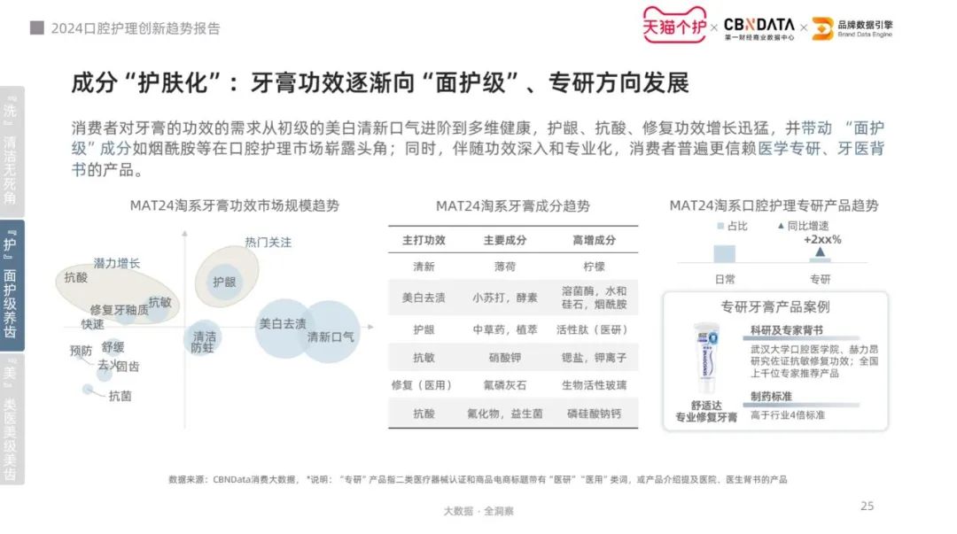 與護膚相似,在“護齒”中消費者也對牙膏的成分與功效更加重視。護齦、抗酸、修復功效增長迅猛,並帶動煙酰胺等 “面護級”成分在牙膏產品中的應用。