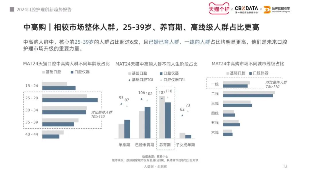 從消費力來看,基礎口腔及口腔儀器消費的中高購人羣增速持續領先市場大盤,是行業增長的重要推動力。中高購人羣中,相較市場整體人羣,25-39歲、養育期、高線級人羣佔比更高,他們擁有更強的消費力,更高的產品接受度,未來有望成為口腔護理市場升級的重要力量。