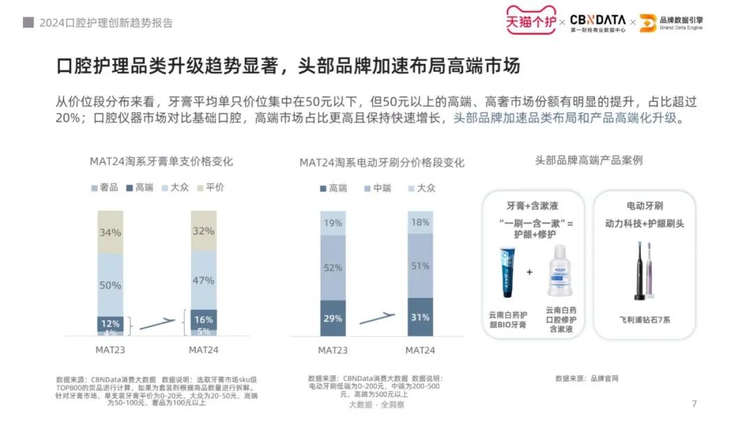 根據產品類別與消費習慣的不同,口腔護理產品可分為基礎口腔與口腔儀器兩大類。在基礎口腔領域,牙膏與牙刷作為基礎口腔護理的重要產品,其消費傾向能夠一定程度反映市場風向。CBNData消費大數據顯示,護齦、抗敏牙膏長期贏得市場青睞,寬薄、細毛牙刷憑藉温和高效的清潔能力成為消費者新寵。從消費價格段位來看,在淘系牙膏銷售中,雖50元以下的大眾及平價產品仍佔據較多份額,但50元以上的高端、高奢市場份額有明顯的提升,佔比超過20%。