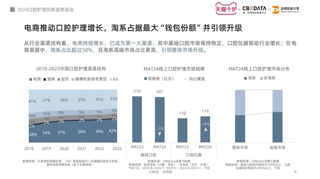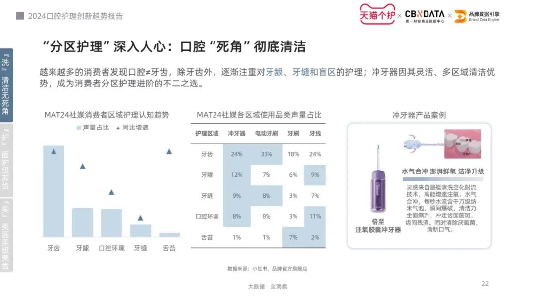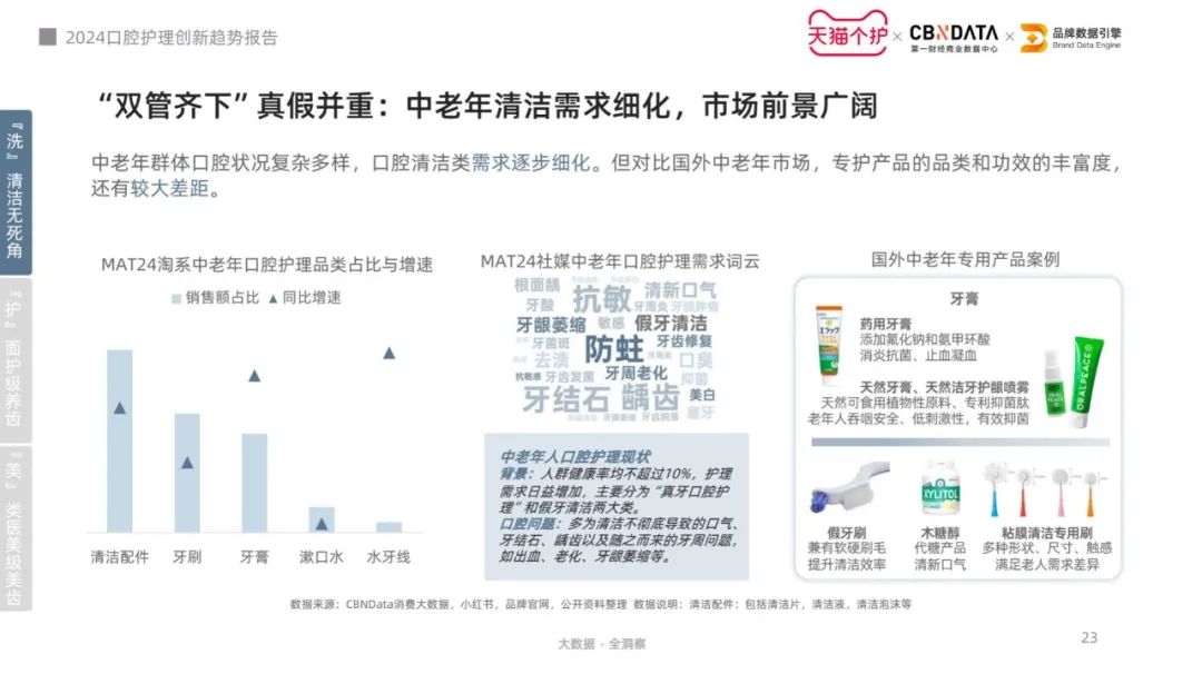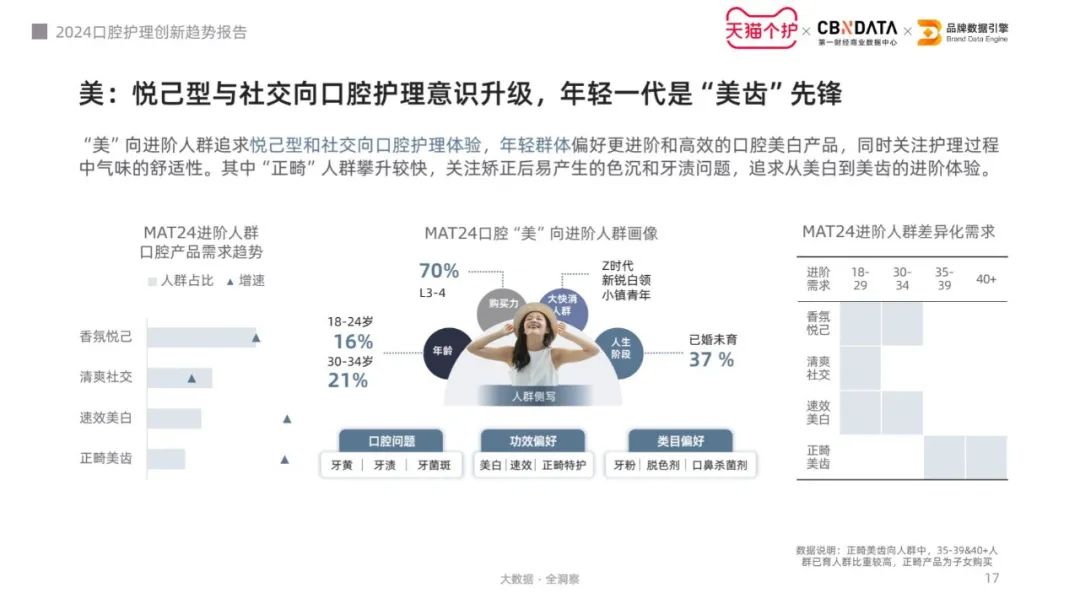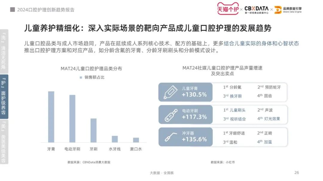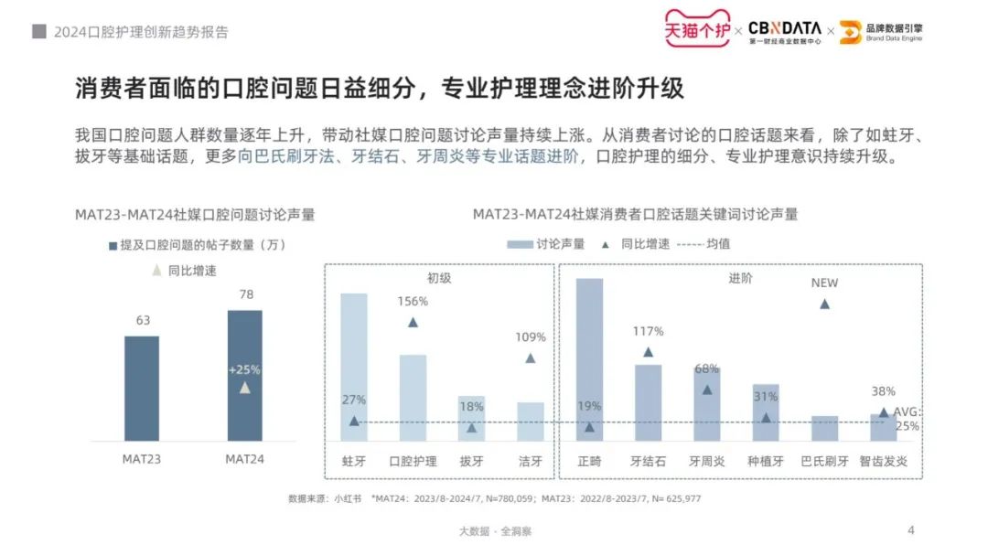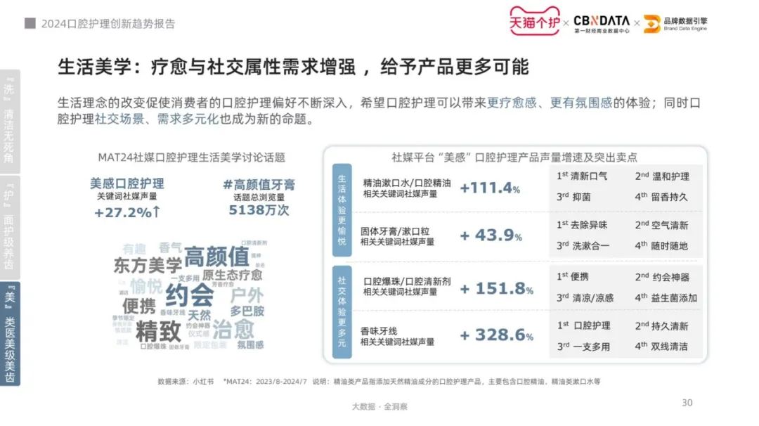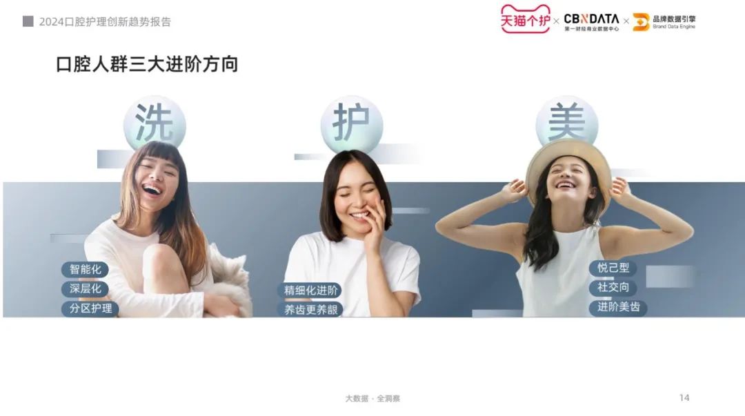 為更好的洞悉行業趨勢,啓示產業貨品更迭升級、實現線上供需耦合匹配,天貓個護聯合第一財經商業數據中心(CBNData)與品牌數據引擎,共同發佈了《2024口腔護理創新趨勢報告》,從市場趨勢與消費人羣入手,拆解口腔護理賽道「洗」、「護」、「美」三個細分領域的升級趨勢與機遇點。