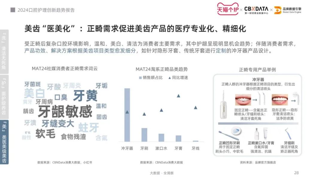 細分來看,正畸需求下,正畸後複雜口腔環境可能帶來牙齦敏感、牙黃、牙縫變大等問題,因此温和、美白、清潔功效成為細分人羣的剛需。因此具有醫療專業性的、精細化的、能夠滿足正畸人羣解決多重口腔問題需求的口腔清潔產品也將受到消費者青睞。