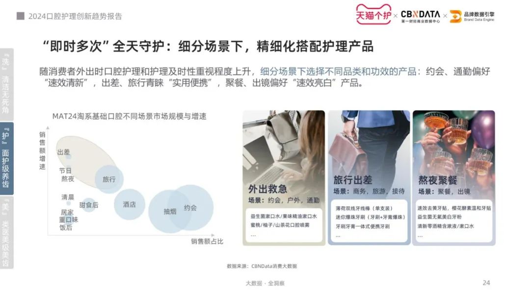 **隨着移動場景不斷增多,口腔護理也超越了家庭場景,向更廣泛的應用場景衍生。**據CBNData消費大數據調查,淘系基礎口腔產品中,應用在出差、節日、熬夜、旅行等場景的口腔護理產品銷售額增速較快。而不同場景之下的不同需求,也催生了許多針對細分場景的功效產品。
