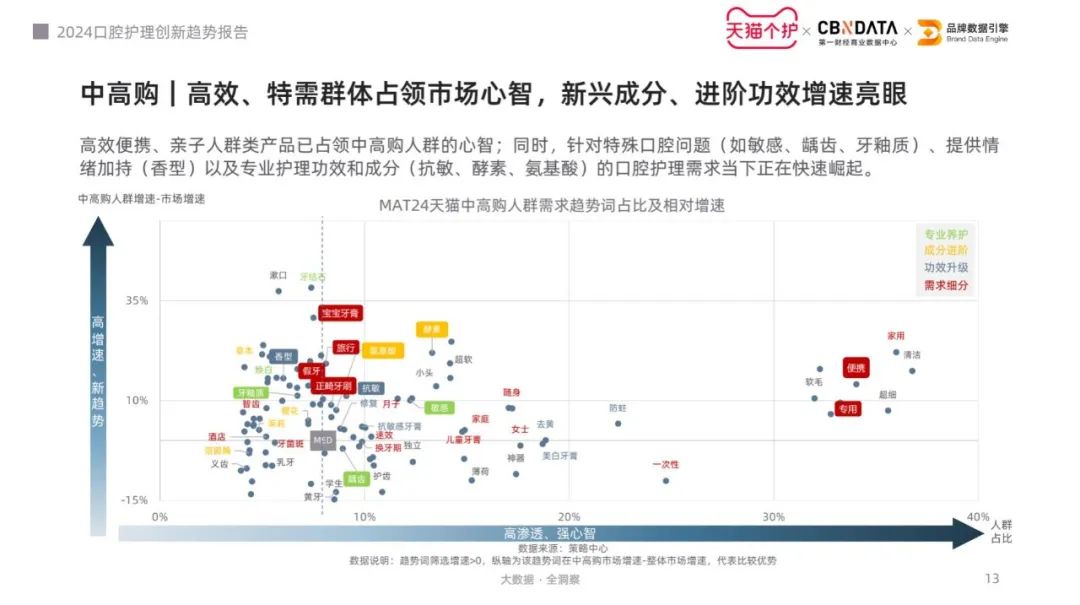 為了更好理解中高購人羣需求,我們通過對比往年數據,製作了《中高購人羣需求趨勢詞佔比及相對增速圖》。由圖可知,高效便攜、專用清潔等需求擁有更高的滲透率;而針對牙結石、敏感、齲齒、牙釉質等特殊口腔問題,以及針對兒童、老人(假牙)、正畸人羣等細分羣體的垂類產品需求增速領先市場,未來擁有較多的增長機遇。此外,通過香型提供情緒加持及含有抗敏、酵素、氨基酸等專業護理功效和成分的口腔護理需求當下正在快速崛起。