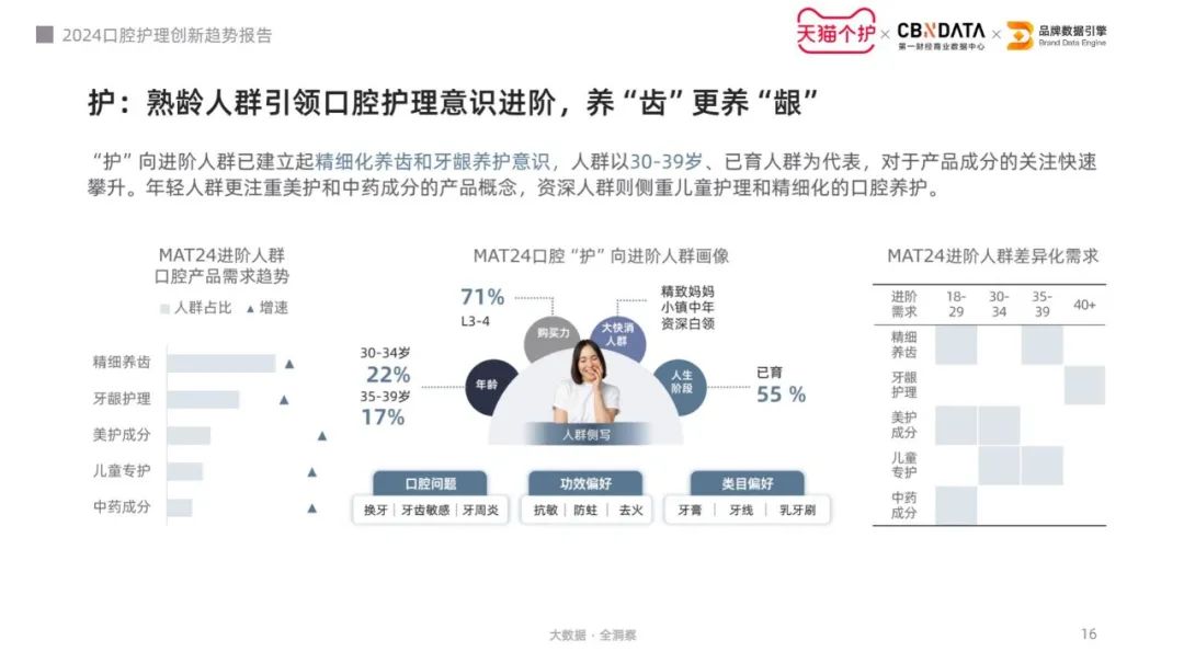 **需求的挖掘助力市場擴容,消費羣體的細分則推動了賽道的縱深發展。**從性別、年齡、人生階段、地域、消費力等方面分析,我們發現口腔人羣正沿着洗、護、美三大方向進階發展。