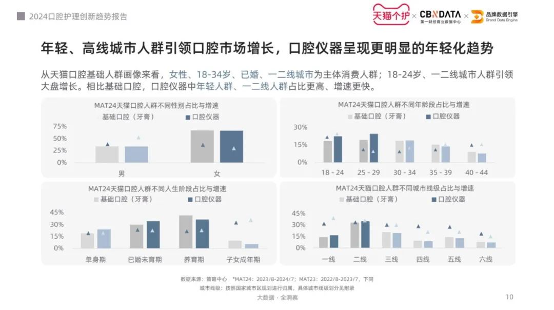 從天貓口腔基礎人羣畫像來看,女性、18-34歲、已婚、生活在一二線城市的為主體消費人羣,其中18-24歲的年輕羣體及高線城市人羣在基礎口腔與口腔儀器領域均引領口腔市場增長,消費增速均在20%以上。與此同時,口腔儀器呈現更明顯的年輕化趨勢,年輕人羣、高線級人羣佔比更高、增速更快,成為購買的主力軍。