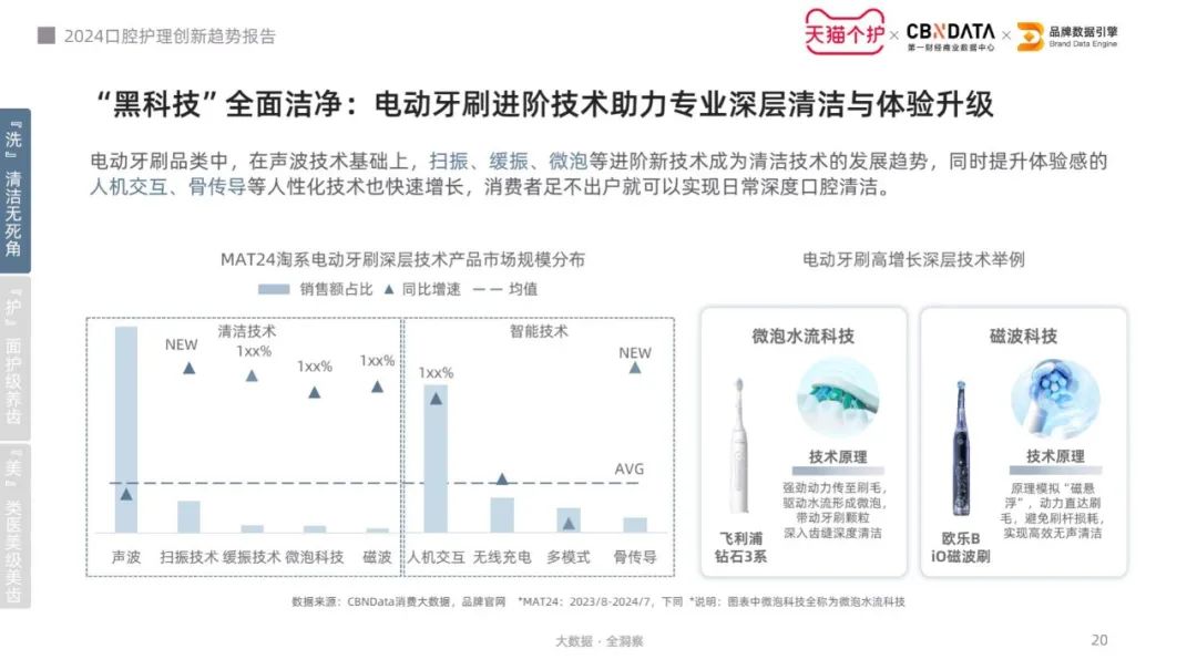 電動牙刷品類中,在聲波技術基礎上,掃振、緩振、微泡等進階新技術成為清潔技術發展新趨勢,疊加提升體驗感的人機交互、骨傳導等高科技,使消費者足不出户就可實現日常深度口腔清潔。如飛利浦將微泡水流科技與緩震科技、智能磁懸浮動力科技結合,不僅能夠滿足齒縫深度清潔需求,更能自由調節、科技護齦。