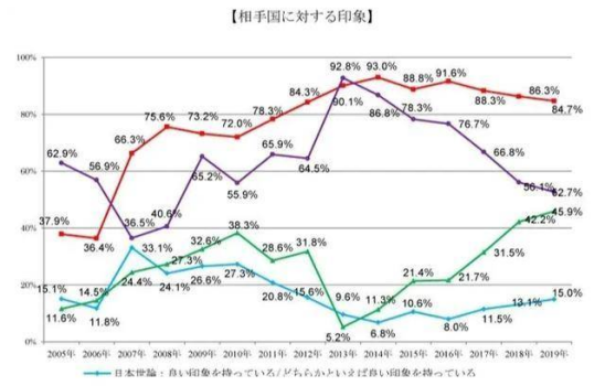 2. 日本民調對中國的負面感覺,近年來在85-90%之間,全球最差。圖為日本非營利組織“言論NPO”和《中國日報》共同實施的輿論調查結果,紅線是日本人對中負面比例,紫線是中國人對日負面比例。2013年時,日本挑起釣魚島爭端,中國人對日負面高達92.8%,日本人對中負面也升至90.1%。之後中國人對日負面比例下跌了不少,日本人對中負面比例維持高位。