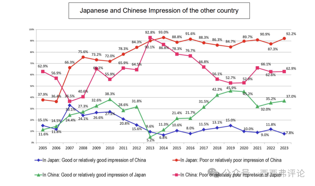 日本非營利組織“言論NPO” 2023年的一次民意調查結果顯示:92.2%的日本受訪者對中國持負面看法;62.9%的中國受訪者對日本持負面看法。中國的反日情緒,在2013年達到頂峯,當時兩國因釣魚島問題發生衝突,反日情緒高達90.1%。根據這項調查,2013年-2020年中國的反日情緒一直呈下降趨勢,2021年才開始回升。