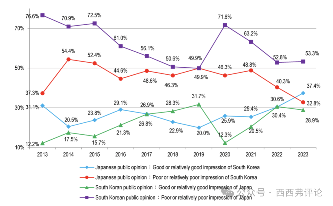 言論NPO進行的類似調查顯示,對日本持負面印象的韓國人比例為53.3%,比中國比例低一些。對韓國持負面看法的日本人比例是32.8%。 2015年以來,日本人的反華情緒幾乎是反韓情緒的兩倍。2023年接近三倍。