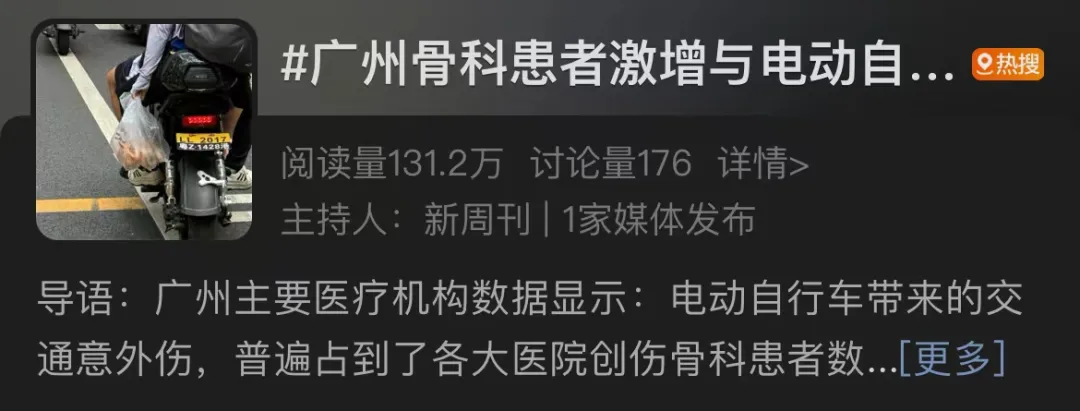 上個月,一則“廣州骨科患者激增與電動自行車有關”的話題登上微博熱搜。廣州自2021年11月在政策層面為電動自行車上路行駛解套鬆綁,卻帶來了“電車越多,骨科越旺”的後果。