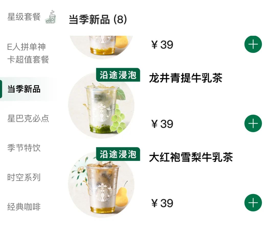 瑞幸推出奶茶一週後,星巴克也坐不住了,在推出新款“茶咖”的同時,推出了兩款牛乳茶產品,分別是龍井青提牛乳茶、大紅袍雪梨牛乳茶。