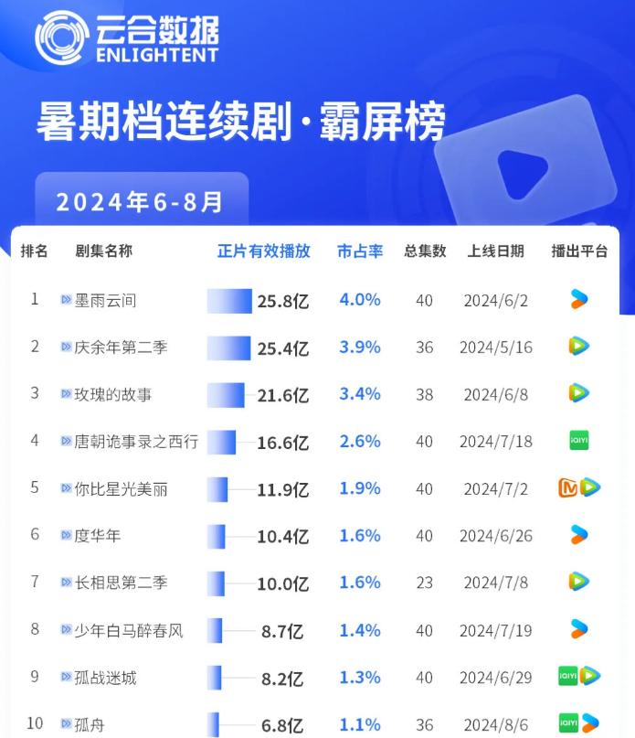 **所謂“古偶滑落”,是指過去是播放量保障的古偶劇,正在急速下滑。**雲合數據的暑期檔連續劇·霸屏榜中,除了第一名《墨雨雲間》斬獲25.8億播放量以外,《度年華》和《長相思第二季》都在10億左右打轉,去年榜首《長相思第一季》則為26.5億,高於今年的狀元《墨雨雲間》。
