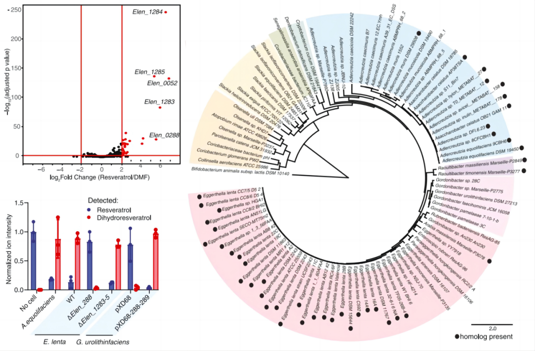 圖注:Elen_288是E. lenta拯救擬桿菌的充分必要條件,在白藜蘆醇作用下Elen_288表達飆升,研究者們還在其他96種菌株中找到了Elen_288基因(右)