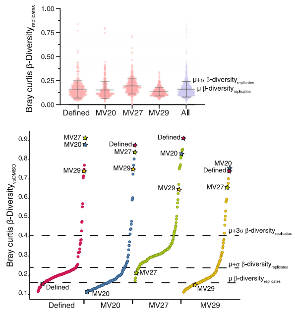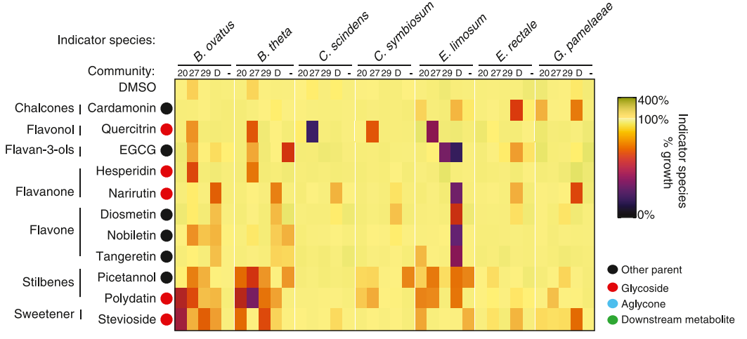 有些在前一輪檢測中對每一種腸道菌都不具有生長抑制作用(即腸菌毒性)的物質,如槲皮素、川陳皮素等,在被研究者們投入到一個完整的人類腸道菌羣羣落裏後卻開始抑制某些菌羣的生長,大刀闊斧地開始對整體腸菌結構進行改造;
