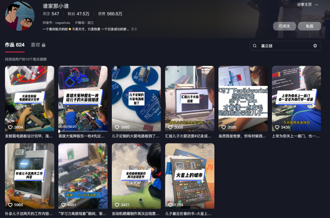 2024年9月22日,抖音博主“誰家那小誰”歷時兩年製作的第一枚固體燃料火箭,成功發射並放傘,這位喜歡航天的“小網紅”,成功路上充滿了行業大牛和相關企業的幫扶身影,其中不乏正在排隊IPO的企業,如深圳嘉立創科技集團股份有限公司(以下簡稱:“嘉立創”)。