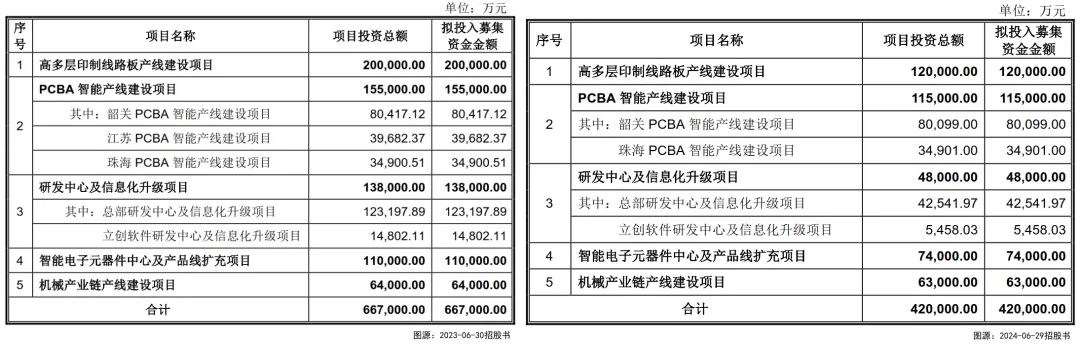 同樣來自公司招股書,2023-06-30招股書中,公司擬募集667,000.00萬元,2024-06-29招股書中,擬籌建的5個項目沒變,公司募集資金降至420,000.00萬元,降幅近三分之一。
