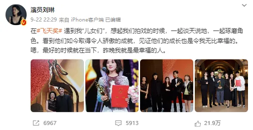 頒獎結束後,劉琳還主動發了一條微博,為戲中的“兒女們”送上最真摯的祝福。
