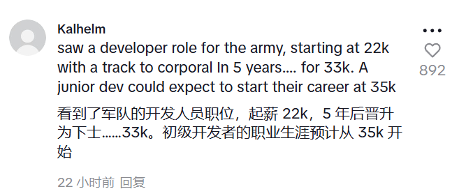 除了當代年輕人普遍的政治冷感,收入偏低也是英國軍隊招不到人的重要原因。以英國陸軍為例,新兵和列兵的起薪為每年25200 英鎊,遠低於英國人民34963英鎊的平均年薪。實際上,在Healey招募遊戲玩家和程序員的視頻評論區裏,不少網友也都在吐槽英國軍隊開出的薪資水平偏低,還不如在其他公司找個班上。