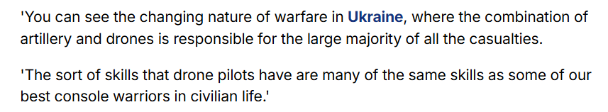“你可以看到烏克蘭戰爭性質的變化,火炮和無人機的組合造成了大部分傷亡,而無人機駕駛員所需要的技巧與日常生活中一些頂尖的主機遊戲高手所具備的許多技巧是相同的。”