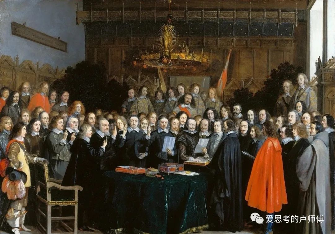 戰爭的導火索是統治着德意志地區的神聖羅馬帝國內部基督教兩大教派——天主教和新教互相瞅着不爽,各邦國各自站隊,結成了天主教聯盟與新教聯盟。神聖羅馬帝國之外的國家出於本國利益,有的支持新教聯盟,有的支持天主教聯盟。這裏面不僅有宗教信仰之爭,還摻雜着多方的王朝現實利益。幾乎歐洲所有重要國家和勢力都參與了這場羣毆,雙方都損失慘重,新教聯盟略佔優勢,最後是天主教聯盟求和,在德意志北部的威斯特伐利亞舉行了和談會議。大家談了4年,於1648年正式簽訂了《威斯特伐利亞和約》。