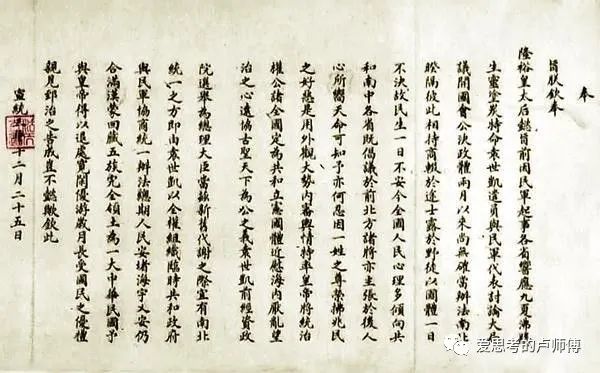 如果按照“驅除韃虜,恢復中華”的路線,中國的國土是不是要回縮到明王朝的傳統疆域內?那接下來緊接的是就另一個棘手問題:此前長期困擾中原王朝的邊患又要重演,國防軍又要重新守長城一線。現實的歷史進程並沒有這樣走,實際革命黨人在中國的政治根基非常淺,武昌起義爆發時孫中山還在海外。真正讓滿清皇室投子認輸的是以軍頭袁世凱為代表的新軍勢力趁機發難。手握重兵的袁世凱是個政治手腕非常老辣的野心家,在風雲突變的政局中他很善於捕捉時機實現自己的野心。面對全國上下的共和呼聲和袁世凱的軟硬兼施,滿清皇室無可奈何地選擇了退位。這一段歷史中的政治博弈是令我非常感興趣的,在此期間發生了奠定中國當今版圖的關鍵大事:滿清皇室簽了《清帝退位詔書》。