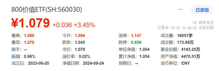 全市場稀缺純正價值標的 800 價值 ETF(560030)漲近4%_風聞