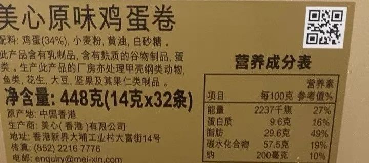 ▲美心原味蛋卷,雞蛋添加量34%,添加量位列配料表第一