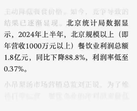 此前,北京統計局公佈了一組令人震驚的數據:2024年上半年,北京規模以上餐飲業利潤同比下降了88.8%,利潤率僅為0.37%。