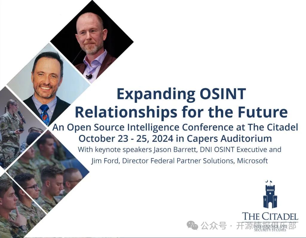 美國南卡羅來納城堡軍事學院的情報與安全研究系將於2024年10月23日至25日在南卡羅來納州查爾斯頓的城堡軍事軍事學院(The Citadel)舉辦2024年OSINT開源情報會議。