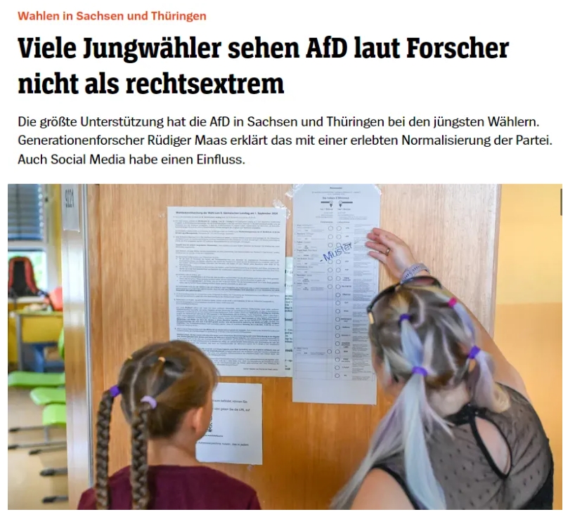 儘管德國聯邦憲法保衞局已將這兩個州的選擇黨歸類為極右翼政黨,但顯然並未影響年輕人的投票。專家認為出現這種現象的原因,是由於該黨在年輕人心中逐漸“正常化”。代際研究專家魯迪格·馬斯(Rüdiger Maas)説:“許多年輕人告訴我們:‘極右翼分子不會對我們造成威脅,他們並不可怕。’將極右視為風險的主要是年長者,但年輕人對此並沒有足夠的警覺。”馬斯表示,德國選擇黨在年輕羣體中的成功以及該黨的“正常化”主要與社交網絡中的內容有關。
