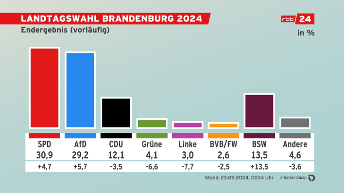 影響朔爾茨地位的勃蘭登堡州選舉非常意外的是社民黨居然獲勝了,還比上次選舉提升了4.7%的比例,共計獲得30.9%的選票。