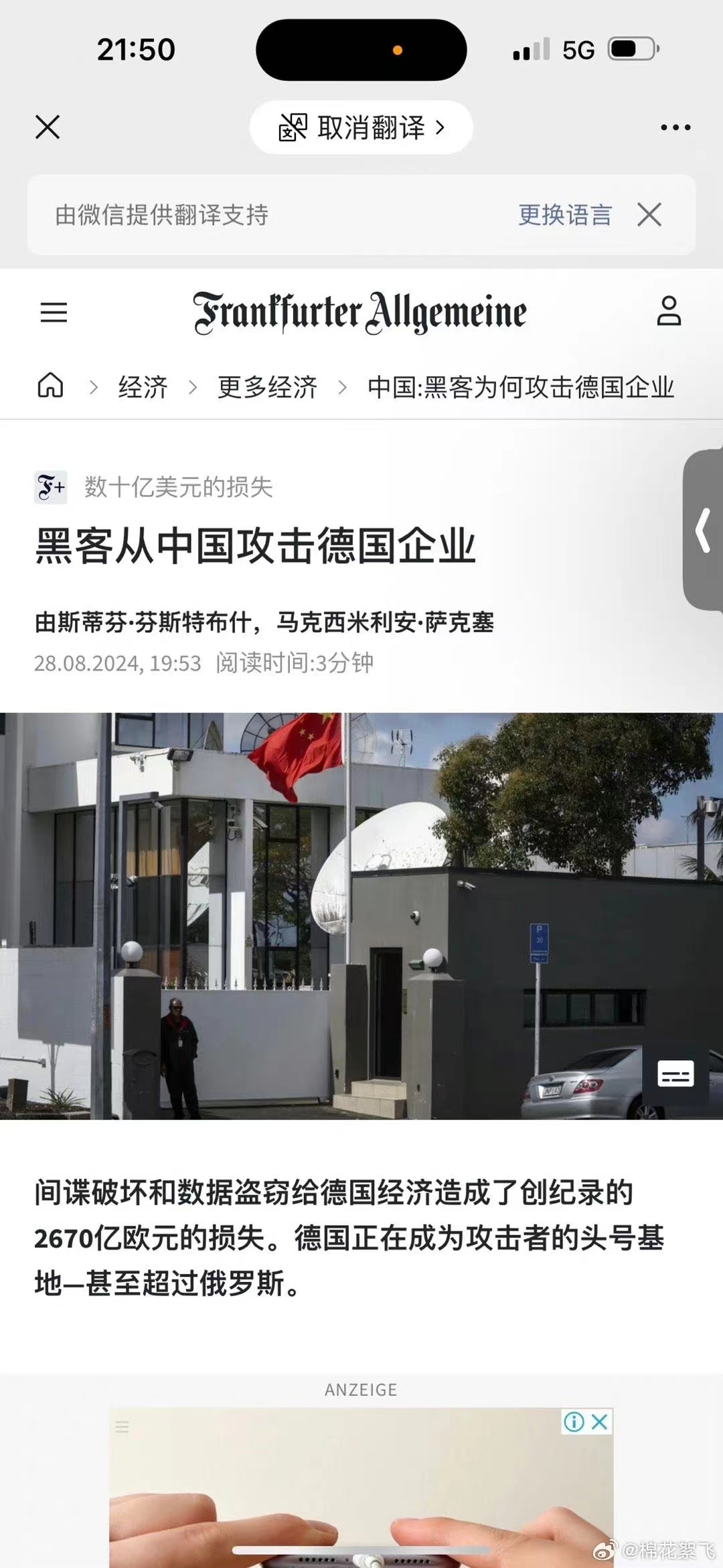 與此同時德國全部主流媒體在報道,甚至某些地方晚報都在大肆污衊造謠稱黑客從中國攻擊德國企業,給德國經濟造成2670億歐元損失。德國主流媒體把經濟不景氣歸根於中國,真的跟這些媒體背後的資本有關,那些資本都或多或少的有美國的影子。全德國媒體把德國經濟制裁俄羅斯,導致成本增加後工廠破產及遷到美國和東歐等國,同時大規模引進非法移民並給予福利,給烏克蘭和美國輝瑞成百上千億歐元導致沒錢的鍋給中國背。筆者認為這個鍋還真不是應該中國去背。