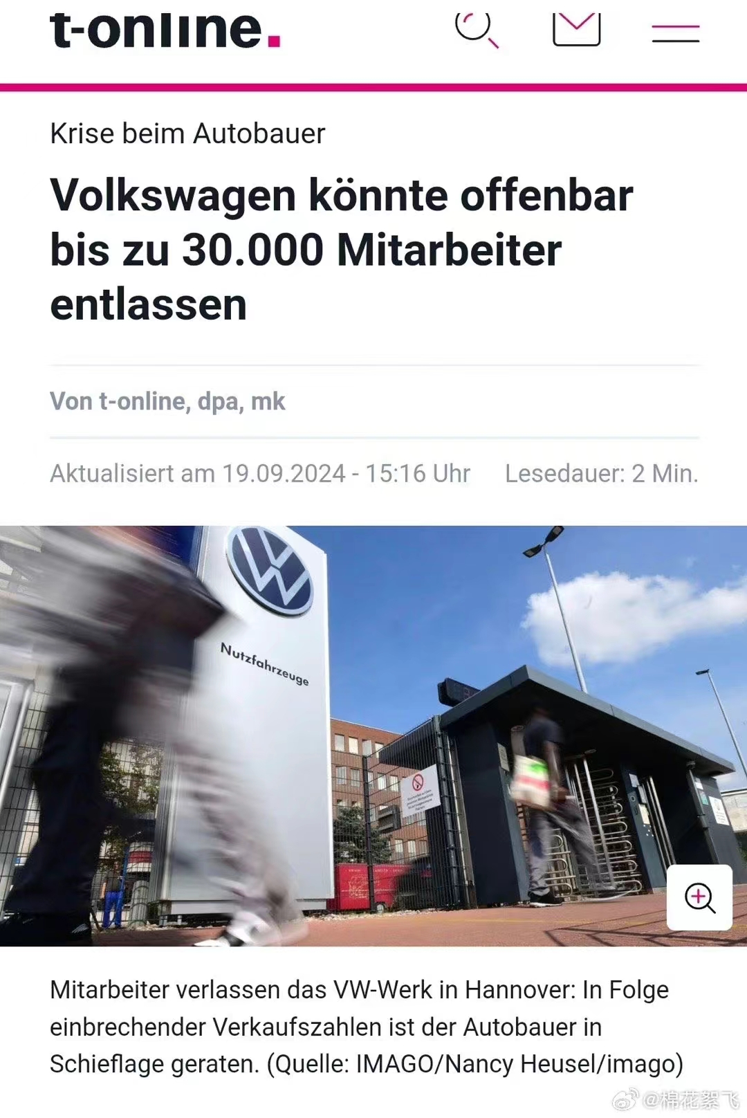 歐洲最大的汽車巨人——大眾汽車深陷危機:不僅面臨關閉工廠的危險,甚至可能要大面積裁員。 據德國媒體最新報道,一條內部消息顯示,大眾汽車希望在中期裁員30000人,也就是近四分之一的工作崗位將被削減。這一切顯示德國車企上下游形勢很嚴峻,四個裏面裁一個還是不少的,據德國電視節目Tagesschau每日新聞報道採埃孚將在2028年底前在德國裁員11000至14000人。