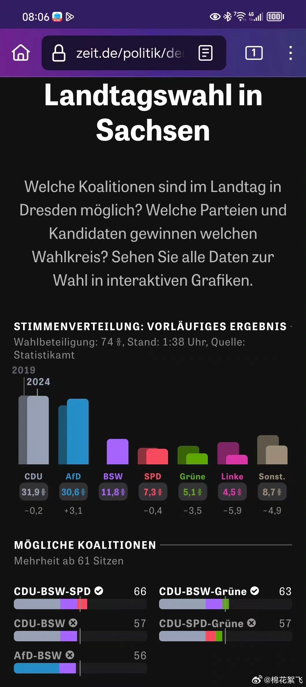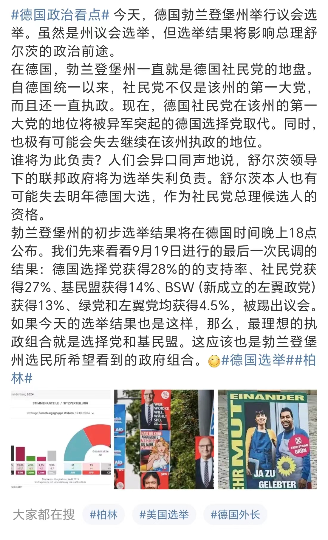 這個消息讓當地的德國華人都感覺不可思議。要知道由社民黨、綠黨和自民黨組建的執政聯盟在移民、環保、預算、通脹和俄烏衝突等問題上矛盾不斷,國內安全及經濟和就業方面出現的問題導致其民意支持率下跌。之前執政聯盟已經在歐洲議會、圖林根州和薩克森州重複了失敗。雖然綠黨和自民黨一如既往的在勃蘭登堡州選舉上丟盔棄甲,丟失了9%的選票,但社民黨好歹贏了德國選擇黨1.7%,而之前的民調結果都顯示後者將贏得勝利。
