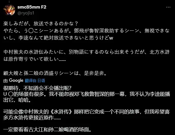 對於此次的翻拍,還有網友表示:日本能不能翻拍好《水滸傳》先不説,問題是感覺他們想把《水滸傳》據為己有!