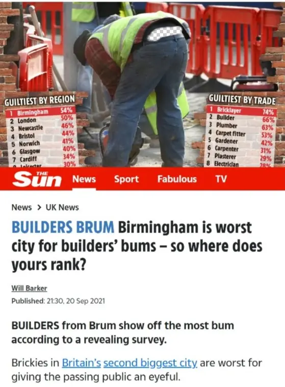 根據一項揭示性的調查,英國伯明翰擁有世界上最多建築工人裸露的屁股。