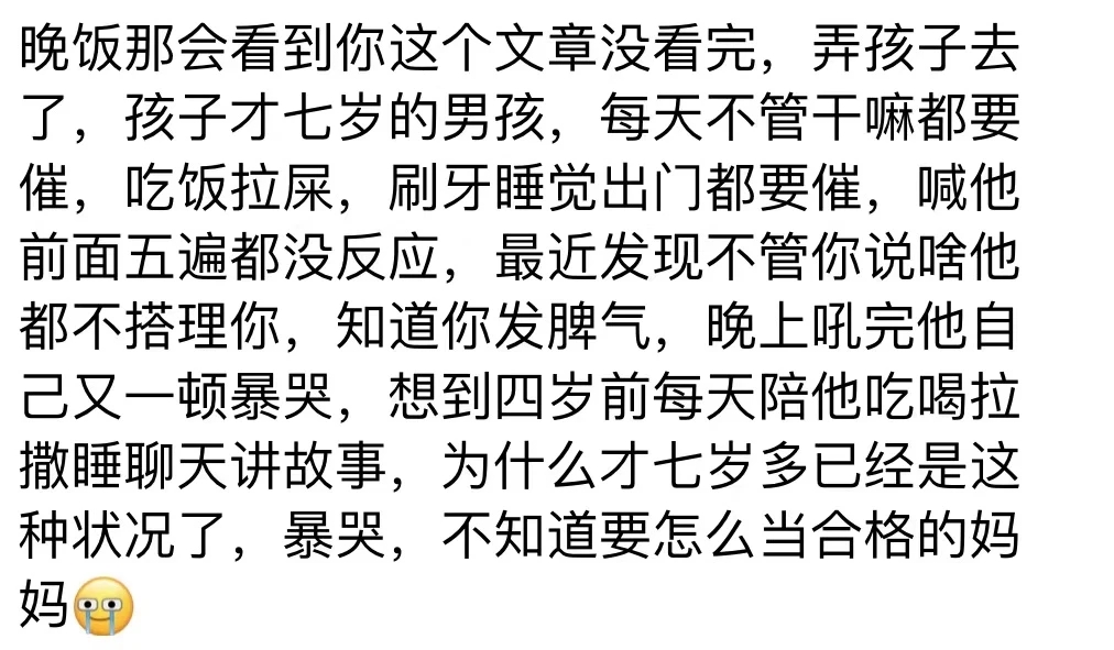 看着這條留言,真是心情複雜。因為常常我也有這種不知道該如何應對的無力感,在育兒這件事上,已經夠努力了,問題是收效甚微。不誇張地説,有時候感覺費了九牛二虎之力,低頭一看,小孩還不如沒發力的時候。