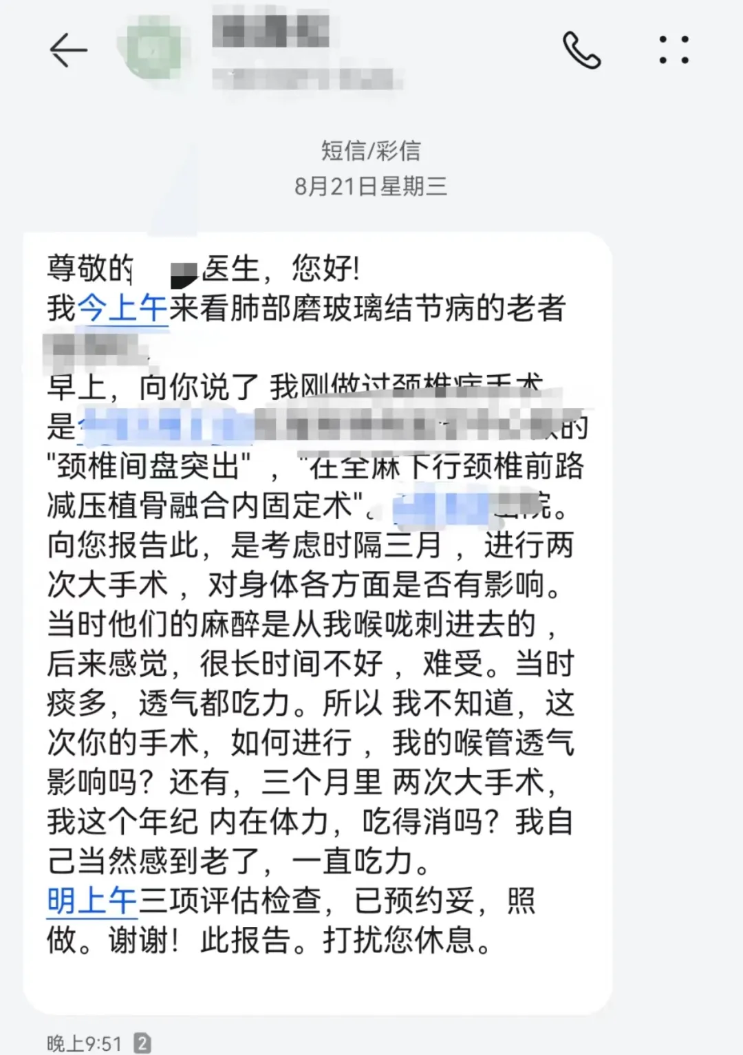 我趕忙給老爺子打電話過去,詳細説明了手術方式。告訴他現在都是單孔胸腔鏡微創手術,而且他的情況只需要做一個肺段切除就可以了,不會影響很多的肺功能,他三個月前的頸椎手術影響也不大。
