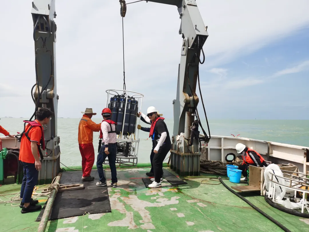 ▲2****024年4月,生態環境部組織開展第三次海洋污染基線調查,圖為工作人員正在將裝有多層海水樣本的Niskin採水器升至甲板。